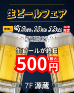 【7階・源蔵】生ビール500円(税込)フェア開催中!!