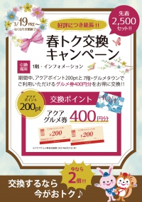 内 容:期間中、アクアポイント200ptで400円分のグルメ券と交換いたします。