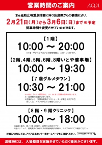 延長要請により、2/21(月)から営業時間を以下のとおり変更させていただきます。