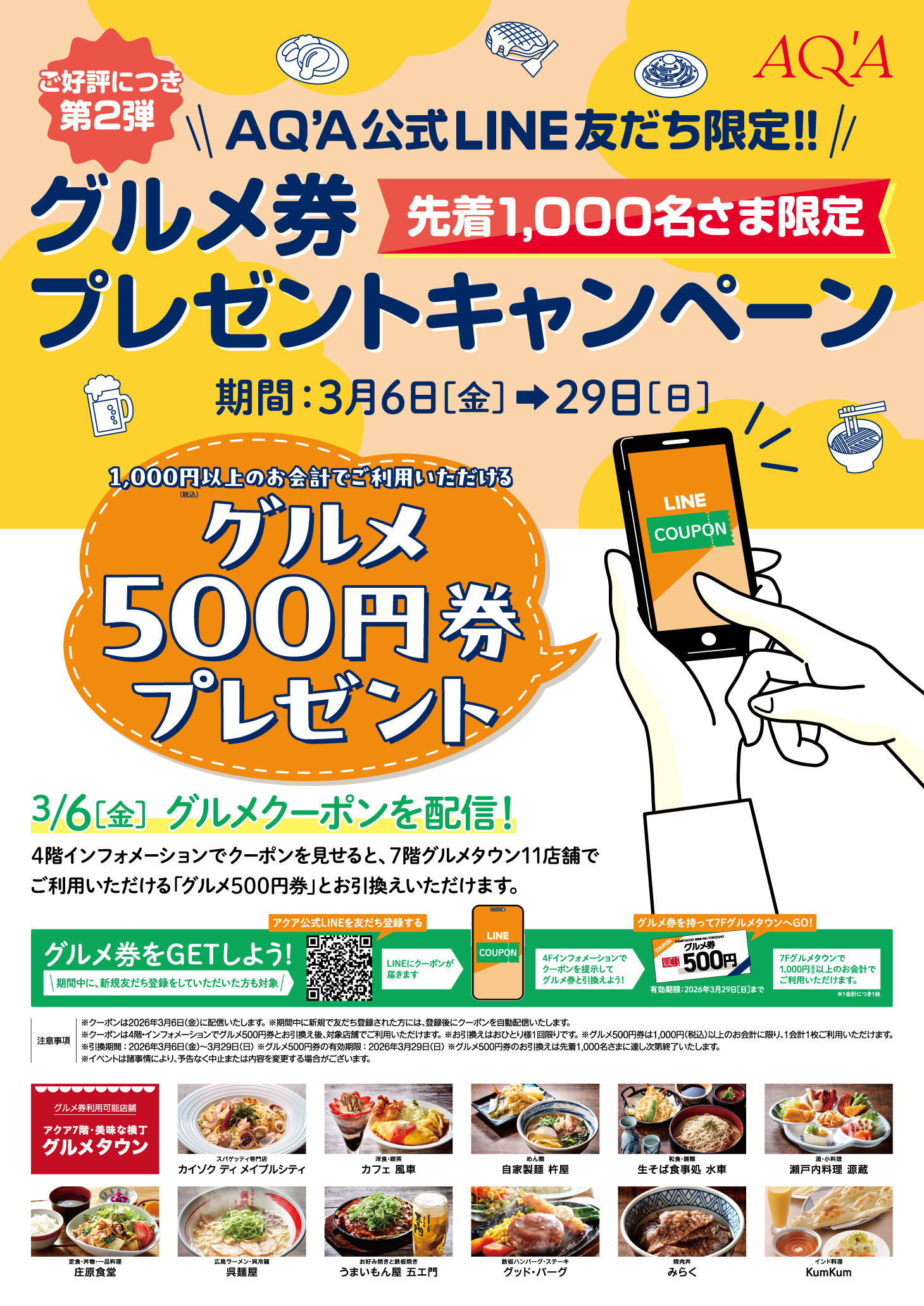 内 容:アクア公式LINE会員様全員に、アクア7階グルメタウンでご利用いただける